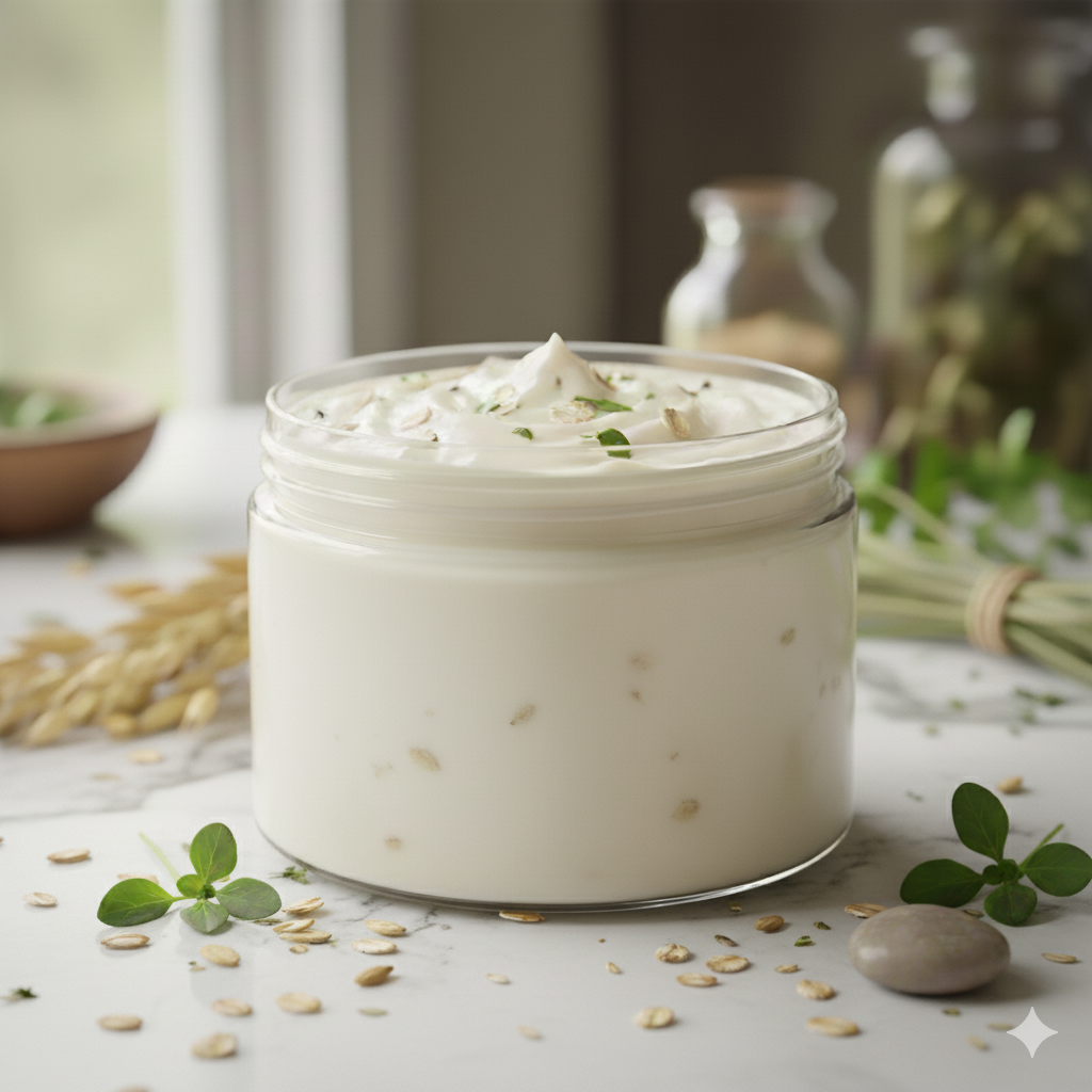 Colloidal oatmeal functions as an emollient, forming a protective, hydrating film over the skin that locks in moisture and reduces irritation. It also balances the skin's natural pH levels. In this cream, it is coupled with Chickweed & Violet, two herbs known to calm and soothe irritated skin conditions.